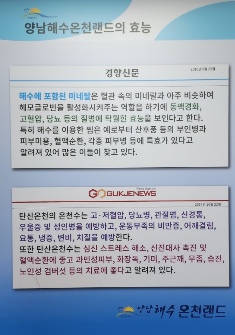 청정해수를 24시간 공급해 항상 깨끗한 수질을 유지하고 탄산, 철분, 미네랄 등이 풍부하게 함유되어 전국에 몇 안되는 탄산온천탕을 보유한 보양온천입니다.  탄산온천은 동맥경화, 고혈압, 당뇨 등의 질병에 탁월한 효능을 보인다고 하고, 심신스트레스 해소와 신진대사 촉진 및 혈액순환 등에도 좋다고 합니다. 직접 다녀온 바로는 세월이 많이 흘러 시설이 노후화가 많이 되었지만 수질이 좋아서 지역민과 관광객들도 많이 찾고 있다고 합니다.