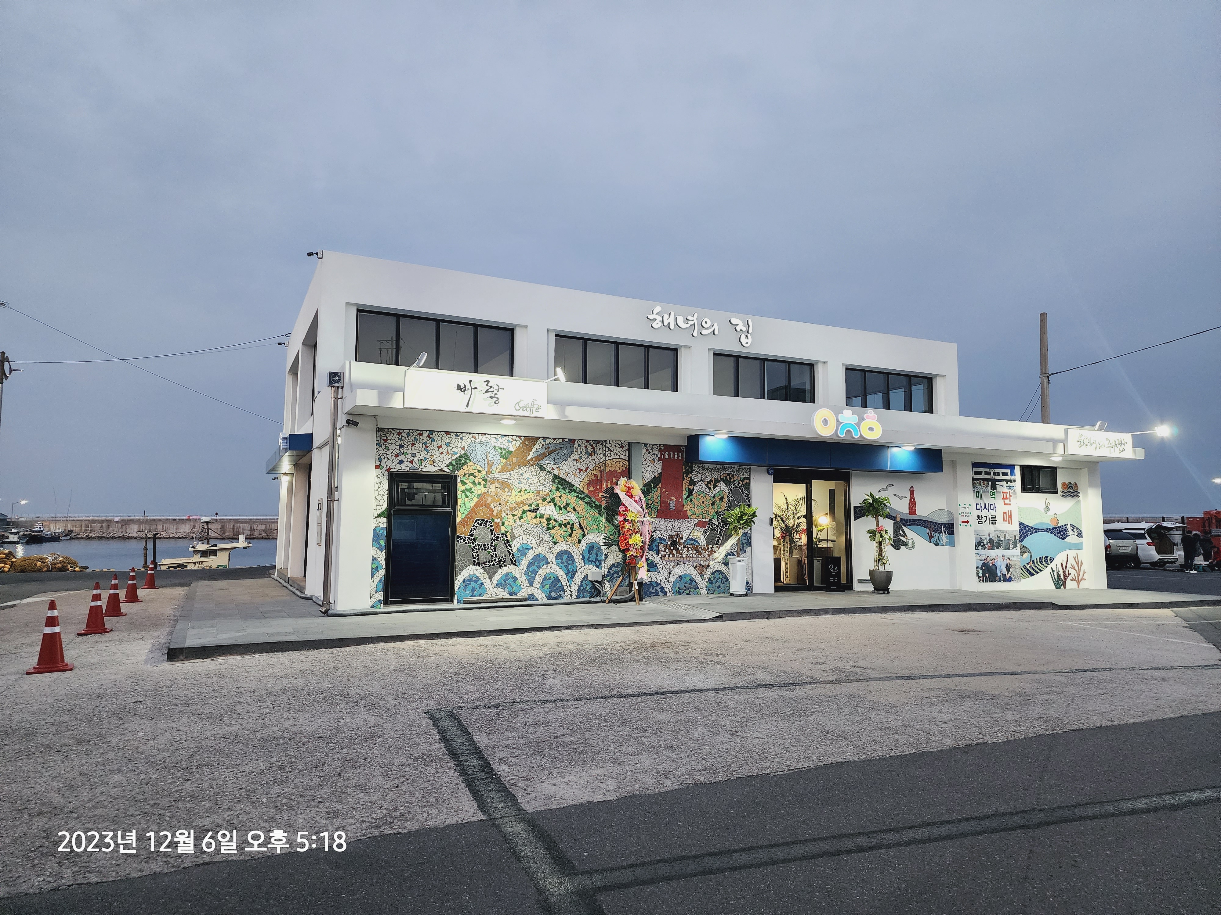 주차장 가운데 떡 계신 해녀의 집입니다. 새로 지은 건물이라 눈에 확 띄네요. 해녀분들이 채취한 재료로 음식을 파는 곳인 듯합니다. 벽에 모자이크가 아주 이쁘네요.