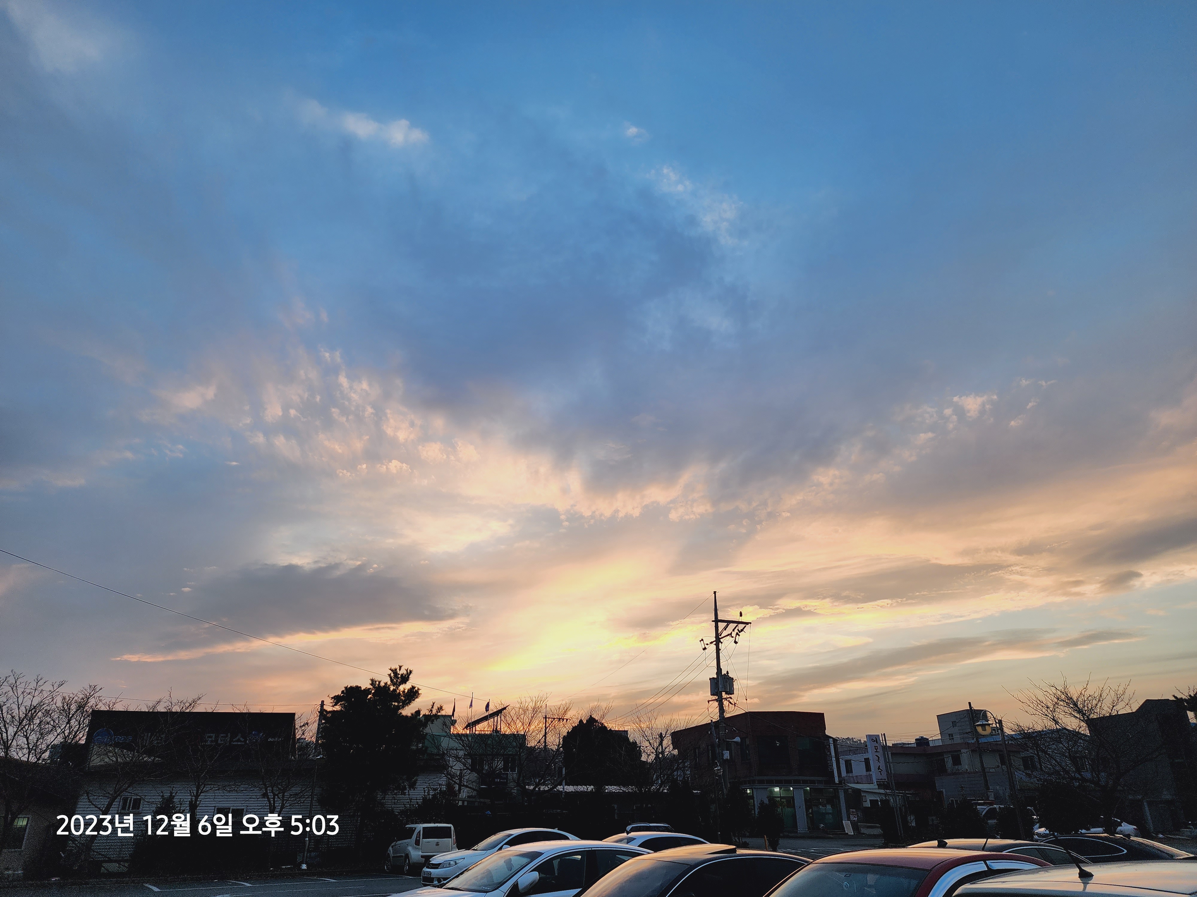 깨끗이 목욕을 끝내고 나와서 주차장에서 본 초겨울 저녁 석양이 아주 일품이네요.