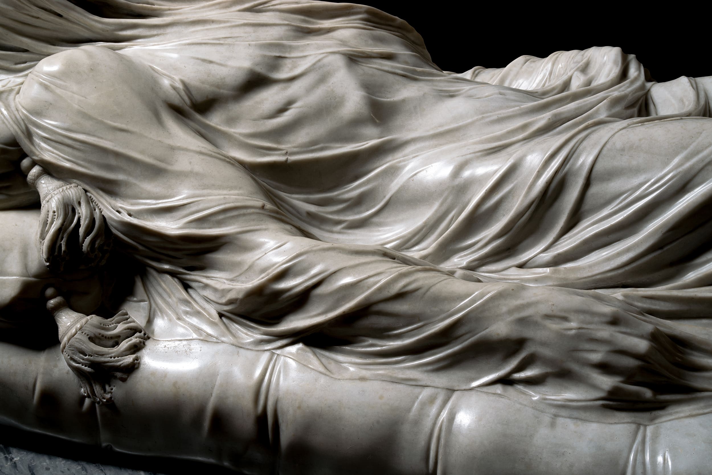 믿기 어렵겠지만 이 베일 역시 예수의 형상과 같은 커다란 대리석 덩어리에서 한꺼번에 깎여 나온 것입니다. 조각가 주세페 산마르띠노는 차가운 돌에 따스한 숨결을 불어넣듯, 마치 실제 천을 덮어놓은 듯한 착각을 일으키는 놀라운 기법을 선보였습니다.