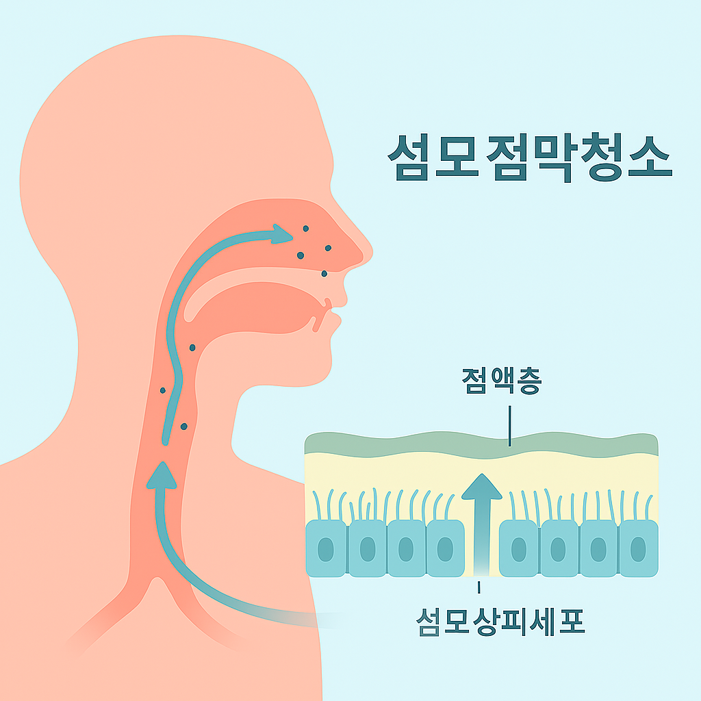 우리 호흡기의 첫 번째 방어막은 ‘점액 섬모 청소 시스템(mucociliary clearance)’입니다. 코 점막과 기관지 내 섬모(cilia)는 끊임없이 움직이며, 점액층에 포획된 먼지·입자·병원체를 목구멍 쪽으로 운반해 제거하죠.